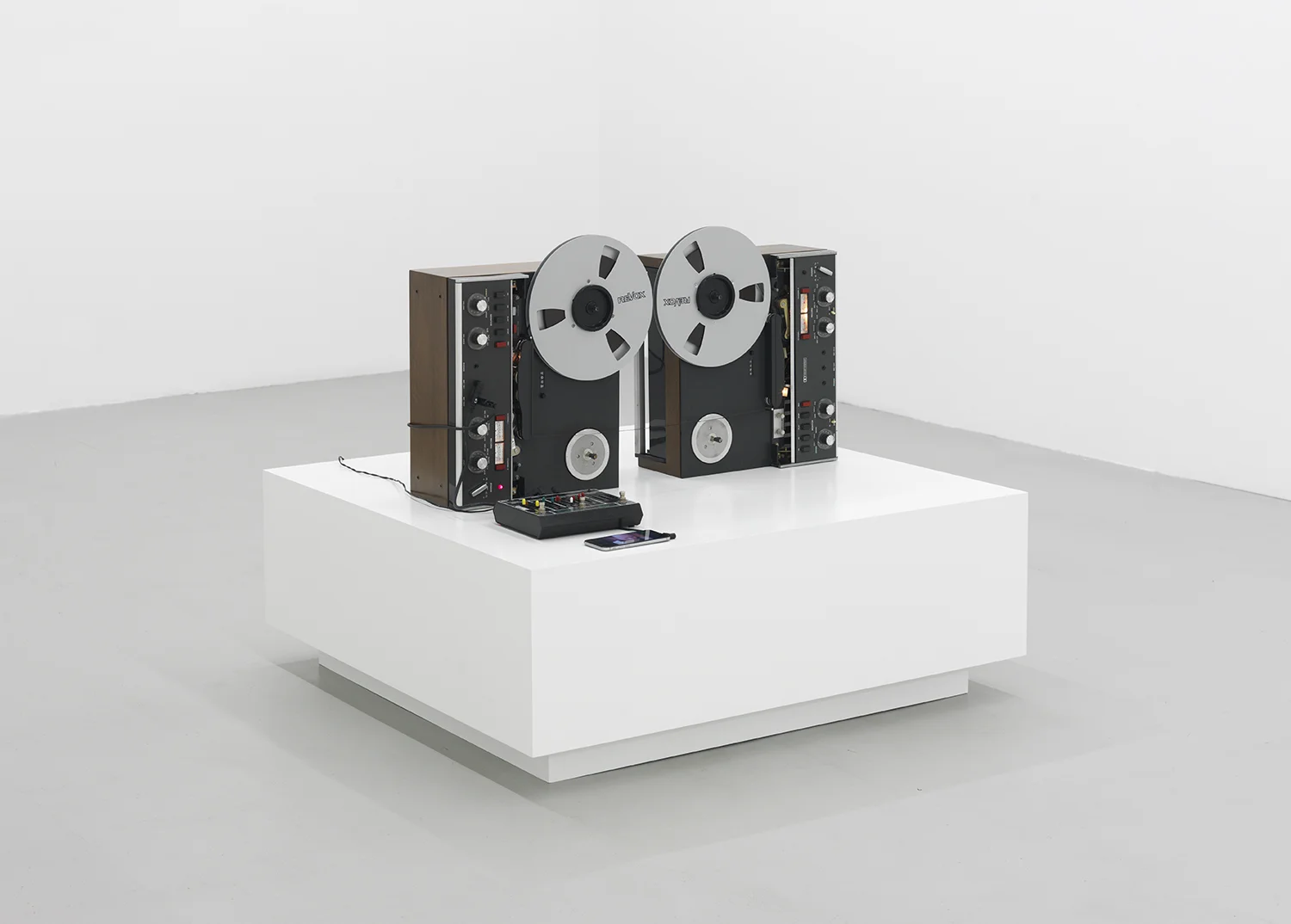 Two Revox A7 MKIII ReelToReel tape recorders, Electro Harmonix 16 second digital delay, and an iPhone on a stage